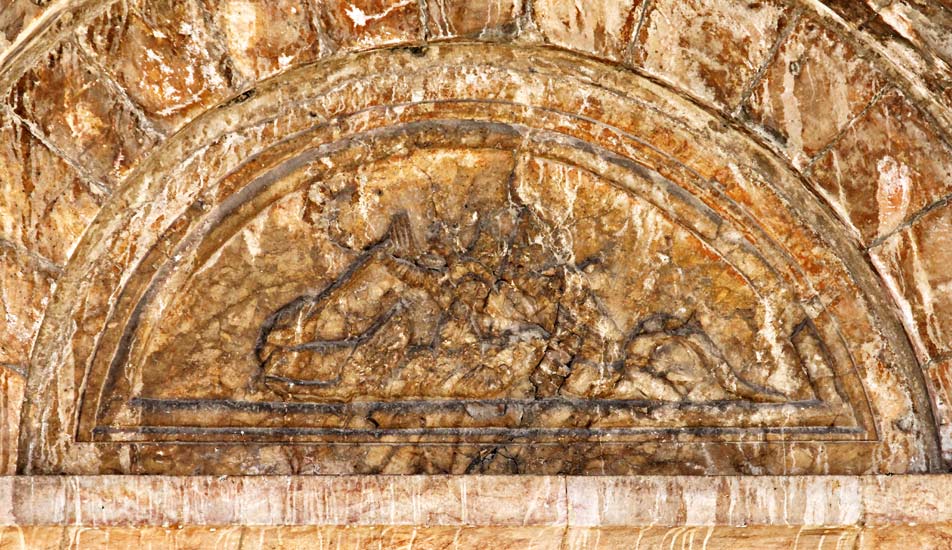 La sculpture du tympan est très endommagée. On y reconnaît Saint Michel terrassant le dragon.