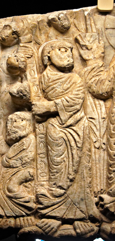Thomas, nimbé, attrape à deux mains la ceinture que Marie vient de lui envoyer du ciel. La représentation de cette seconde incrédulité de Thomas est très rare dans la sculpture de cette époque.