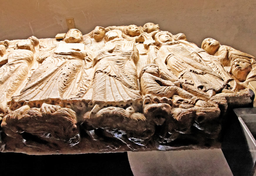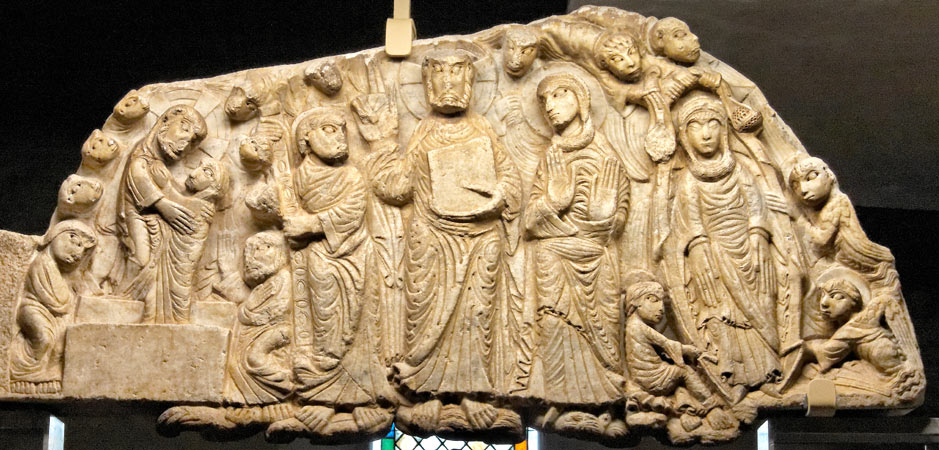 Le tympan : Au début du XXème siècle, ce tympan se trouvait encastré dans le mur de la nef principale au sud. Il fut déposé au presbytère lors des travaux d'agrandissement. Il pourrait s'agir d'un marbre de remploi. Ses dimensions sont de 2,05 m de long pour 0,84 m de hauteur maximale. Son épaisseur est de 22 cm. Sous le tympan est sculptée une frise d'animaux sauvages sur lesquels s'appuient les personnages (voir la photo ci-dessous). L'existence de cette frise rend impossible l'emploi de ce marbre comme