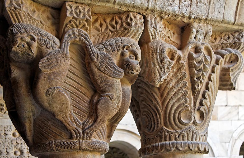 Chapiteaux V et VI : Griffons à têtes de lion affrontés, montrant les dents et dressés sur leurs pattes et grandes feuilles d'angle. |