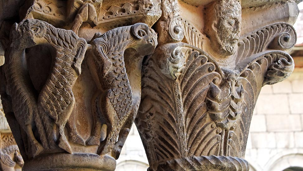 Chapiteaux VII et VIII : Bouquetins affrontés dressés sur leurs pattes et grandes feuilles d'angle avec têtes humaines au centre. |