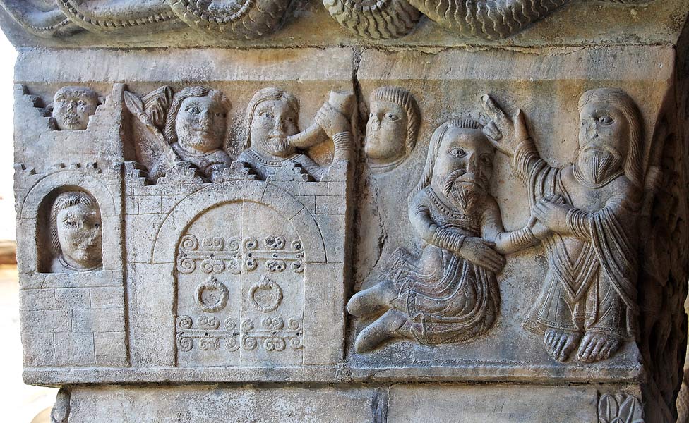 Pierre s'enfuit de Rome et rencontre en chemin le Seigneur qui lui y va. Et Pierre lui demande : "Quo vadis, domine?" (Où vas-tu, Seigneur?). On connaît la suite,Pierre retourna à Rome et y fut martyrisé. Rome est représentée comme une ville fortifiée du Roussillon, avec des créneaux et une porte à pentures. Un soldat sonne du cor pour annoncer la fuite de Pierre. |