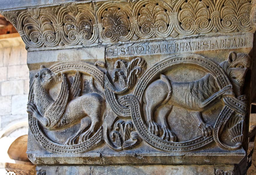 Face ouest du pilier : dans un entrelacs perlé, sont représentés à droite un lion et à gauche, un griffon. Au dessus court une inscription en latin , premier verset du Psaume 82,.vantant les douceurs de la vie commune (Durliat, 1958). |