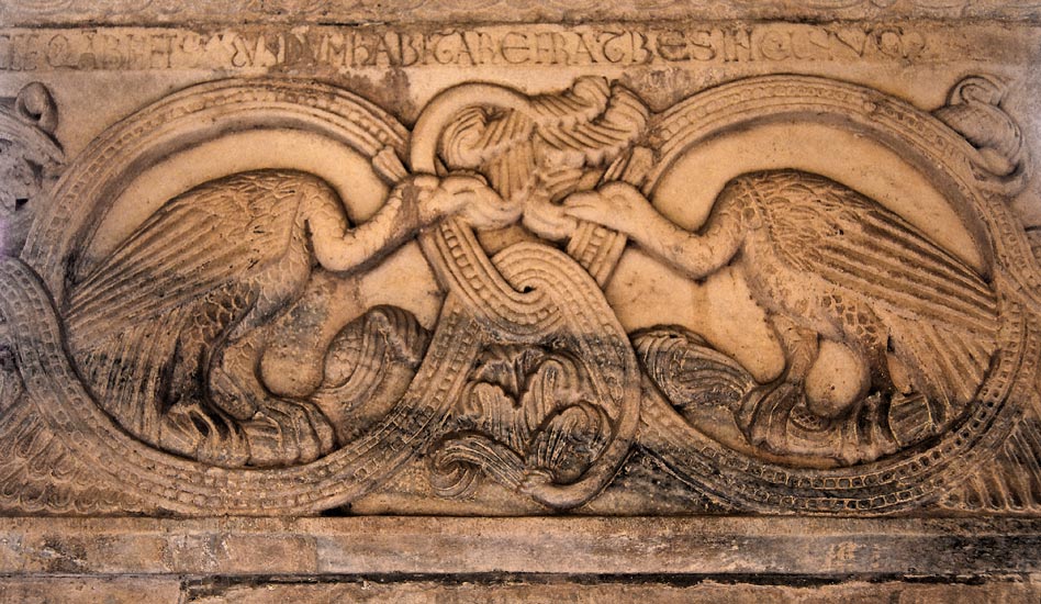 Face sud du pilier : dans l'entrelacs, se trouvent ici deux paons affrontés. Au-dessus, la fin de l'inscription. |