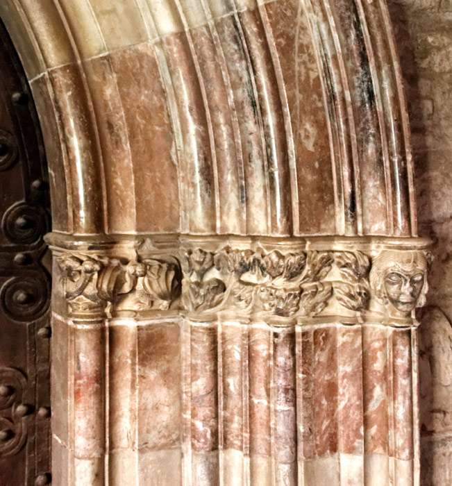La porte d'entrée vers la cathédrale est une oeuvre gothique du XIVème siècle. Les piédroits et les voussures sont en marbre, alternativement blanc et rouge. La sculpture est de qualité. les ferrures, quoique d'aspect archaïque sont récentes.