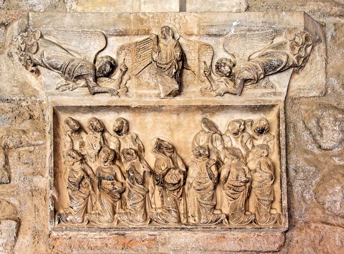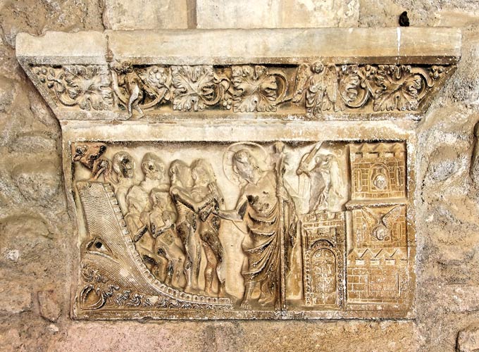 Dans les murs des galeries sont incrustés de nombreux reliefs, épitaphes ou dalles sculptées, de factures très diverses. Sont montrées ici les deux représentations les plus ouvragées. |
