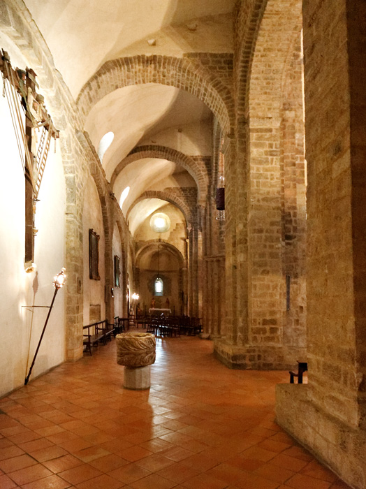 Les collatéraux sont couverts de voûtes en quart-de-cercle. Certains des piliers sont posés sur des dés de maçonnerie de 0,5 à 0,8 mètres de hauteur. | Vers l'avant, certains piliers de plan cruciforme sont formés de colonnes ou de demi-colonnes engagées.. |