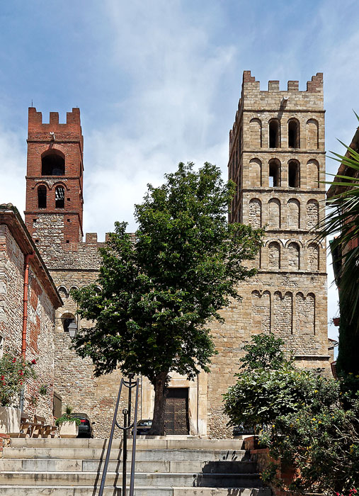 La grande façade romane a été conçue dans un esprit de parfaite symétrie. Malheureusement le clocher nord n'a pas été construit et il a été remplacé par une tour en briques. Le clocher sud est une imposante tour à quatre étages avec des arcades jumelées. Les deux étages du haut sont du XIIème siècle et des fenêtres ont été percées pour laisser passer le son des cloches.
