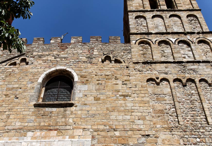 Le centre de la façade était orné d'un fronton triangulaire dont voit encore les départs. Ce fronton a été détruit pour laisser la place à un ensemble de créneaux défensifs. A droite, les premiers étages aveugles du clocher. |