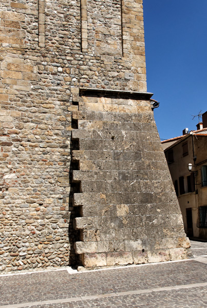 La tour du clocher fait 25 mètres de haut à 4 étages d'arcades jumelées. Les 3 premiers étages sont aveugles. Le premier est orné d'arcatures portant des modillons. Les 4 étages ont été bâtis légèrement en retrait les uns des autres. | Ce grand empattement en pierres de taille a renforcé le clocher en 1415, ébranlé par une secousse sismique. |