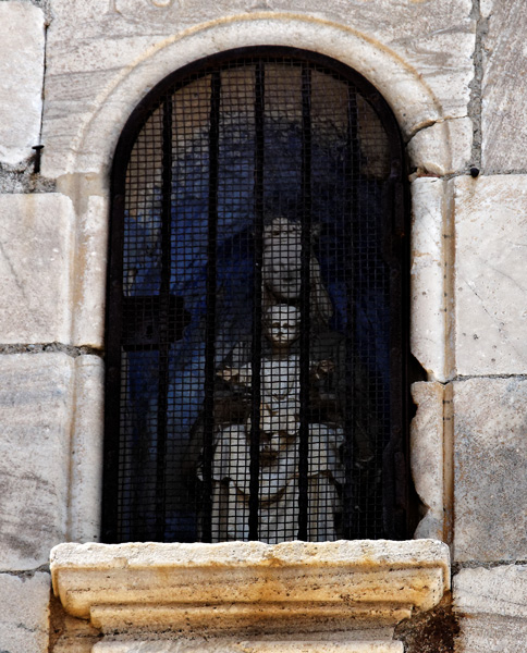La porte de l'église en marbre blanc date de 1669. Elle est surmontée d'une niche dans laquelle se trouve une statue de la Vierge que vous pouvez mieux entrevoir ci-dessous. |