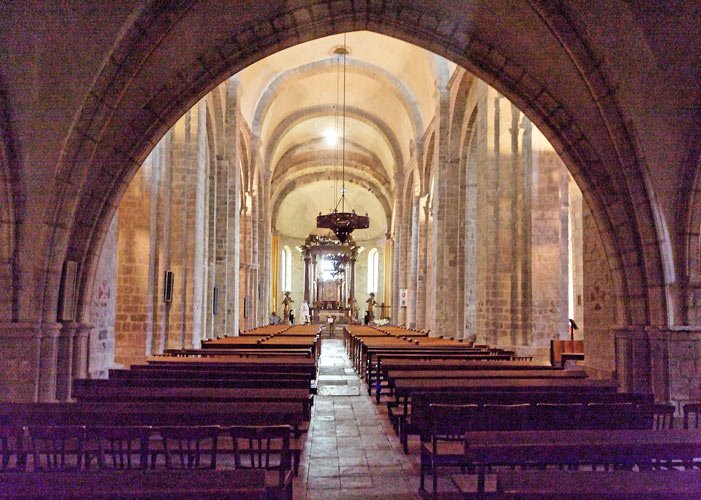 C'est un vaste bâtiment, de 49,50 m de long sur 20,50 m de large. Il comporte trois vaisseaux et sept travées. La nef n'est éclairée que par les ouvertures des collatéraux. Entre la fin du XIIIème et le début du XVème siècle, six chapelles gothiques ont modifié le collatéral sud. La façade des piliers offre un fruit très prononcé : la nef est donc plus étroite à la base des piliers qu'à leurs sommets. |