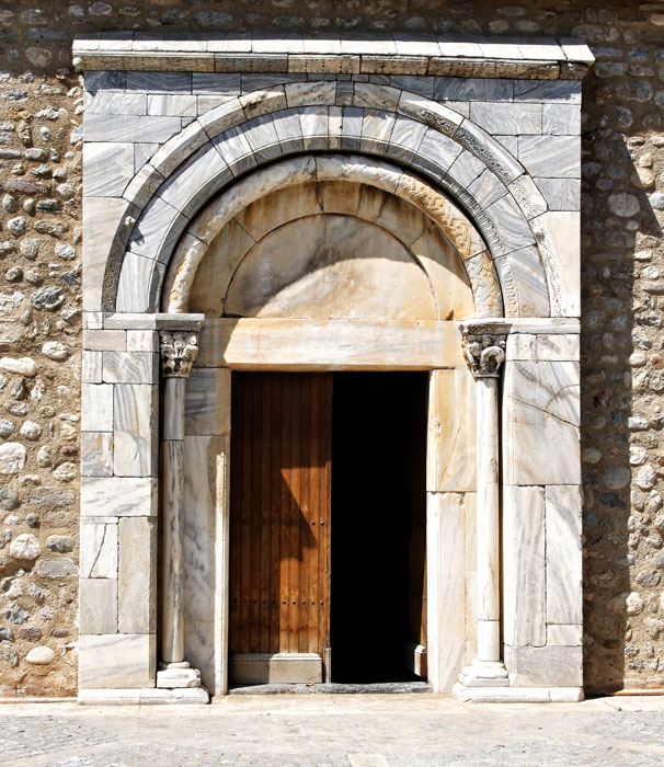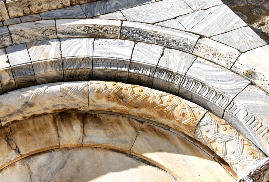 Le détail des voussures permet d'observer les rares motifs en haut relief (têtes, fleurs).