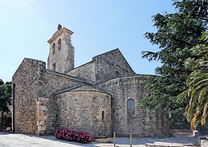 .Fondée à l'époque de Charlemagne, l'abbaye de Saint-André eut du mal à subsister. Cloître et dépendances ayant disparu à le Révolution, seule subsiste l' église. Les études permettent de distinguer trois étapes de construction. De la plus ancienne, au Xème siècle, datent le plan en croix latine et les assises des murs en opus spicatum (en arêtes de poisson). Les maçons de la 2ème campagne ( vers 1020) utilisèrent des matériaux différents, de petits moellons cassés au marteau. Le décor de la façade daterait de cette période. Vers le début du XIIème siècle, avant la consécration, la 3ème période vit le couvrement en voûte en berceau. L'abside principale est plus profonde que les absidioles de côté.