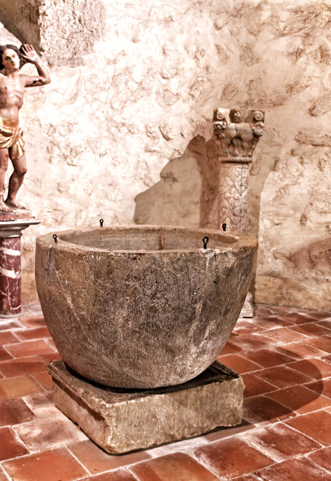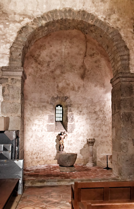 L'absidiole du côté gauche contient différents mobiliers : une statue, une cuve et une colonne surmontée d'un chapiteau (voir ci-dessous). |