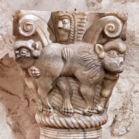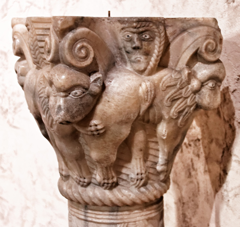 Ce chapiteau dont il ne reste que la corbeille provient peu-être de l'ancien cloître de l'église. |
