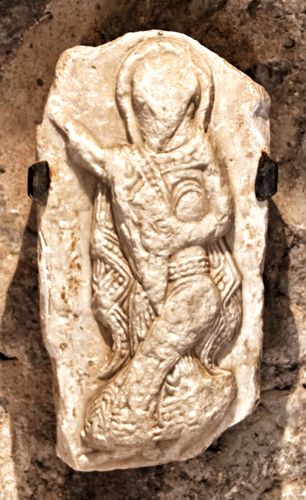 Fragment de linteau(?) représentant la Vierge à l'enfant. |