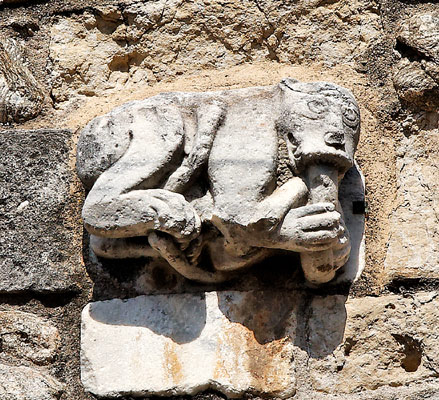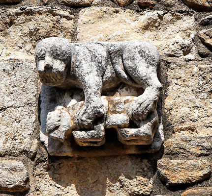 Au-dessus du portail, deux lions sont sculptés en haut-relief. Ils sont représentés en train de dévorer des animaux. Celui de gauche est un serpent. C'est la victoire du Bien sur le Mal. Les lions jouent ici un rôle protecteur. |