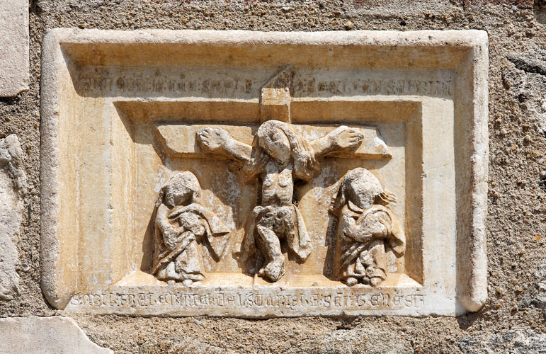 A droite de la porte, la pierre épigraphiée de Frère Miquel, abbé de 1271 à 1281 et décédé en 1307. |