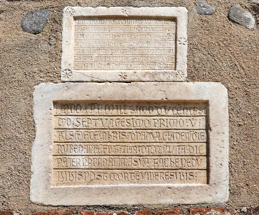 A gauche en regardant la porte, se trouvent en haut les pierres épigraphiées de Frère Berenguer, camérier , décédé le 6 juin 1307 et de sa soeur dame Mathia. En-dessous, la pierre de Dulce de Mont-Roig, décédé le 5 décembre 1271. |