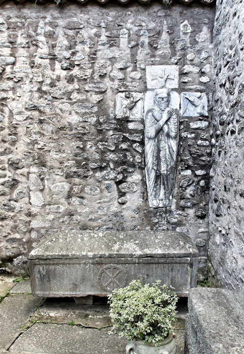 Ce gisant est encastré dans le mur méridional du parvis de l'ancienne abbatiale d'Arles-sur-Tech. Il date du début du XIIIème siècle. En dessous, le sarcophage date du IVème ou du Vème siècle.