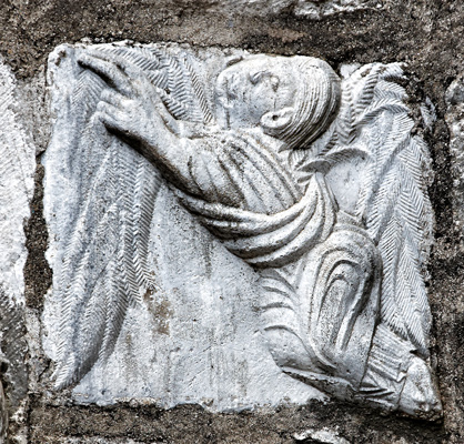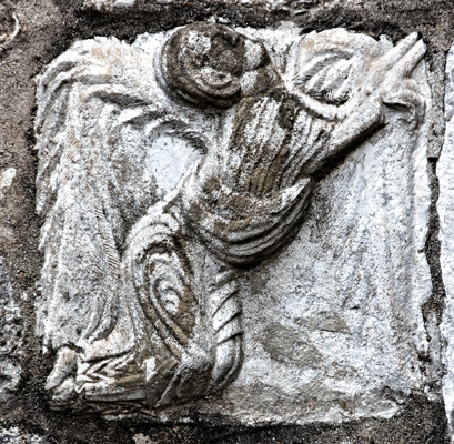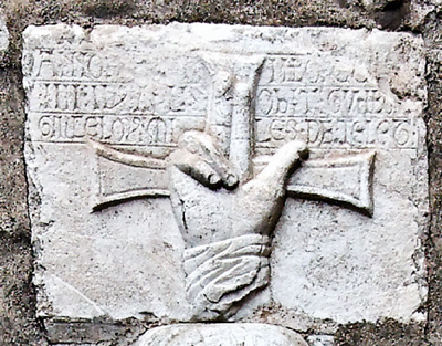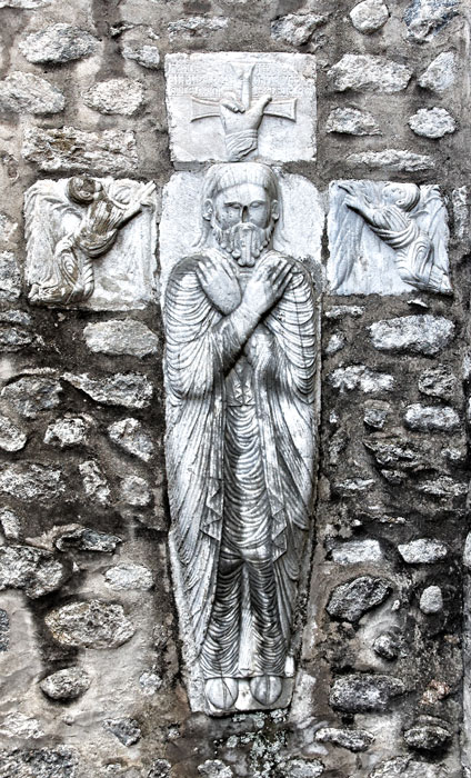 On peut remarquer aussi la facture des anges. Le personnage est identifié par une inscription sur le bloc supérieur, de part et d'autre de la main de Dieu posée