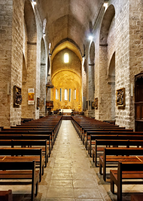 Vue de la nef vers l'ouest : la séparation entre les trois vaisseaux de la nef s'effectue par d'énormes piliers rectangulaires supportant de grandes arcades en plein cintre. Le haut-vaisseau était primitivement charpenté : la voûte en pierre en berceau brisé continu a été installé au XIIème siècle.