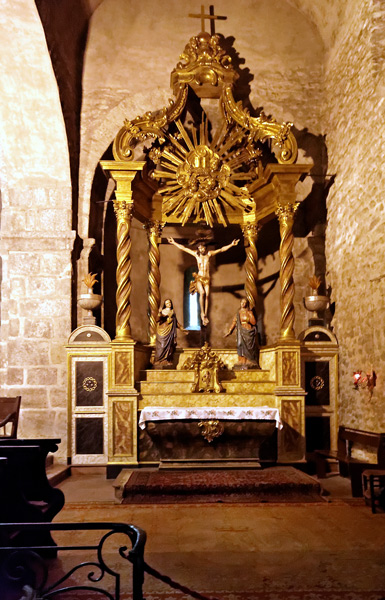 L'absidiole de droite : le retable dit du Christ, avec une architecture plus aérée, caractéristique de la dernière expression du baroque en Roussillon.