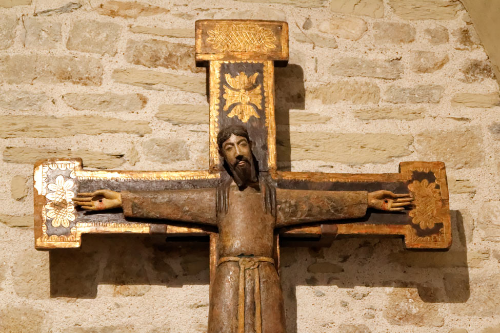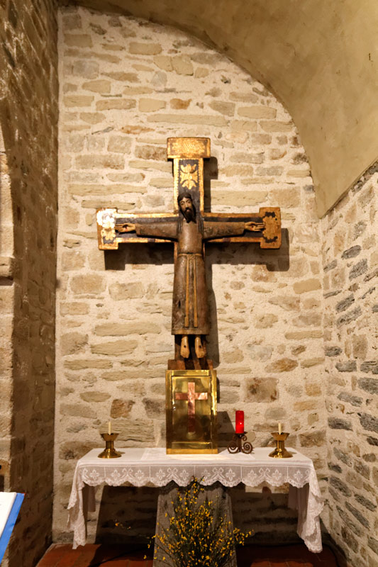 Sur le mur du fond, ce Christ roman habillé du XIIème siècle ou Majestas est la plus belle et la plus grande des sculptures en bois de ce type. La polychromie date du XVIIème siècle.