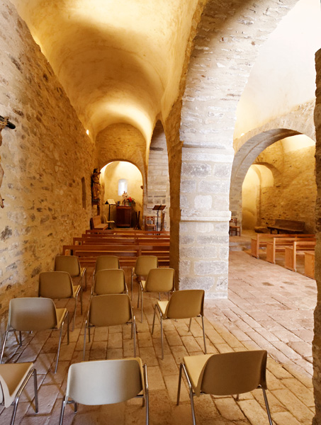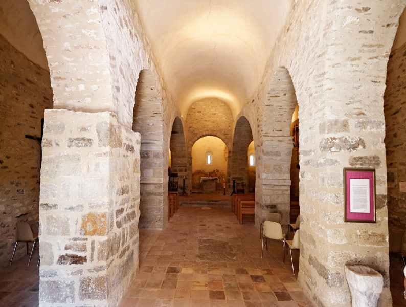 Deux grands arcs en plein cintre reposent sur des piliers de tradition pré-romane. Ils séparent les nefs voûtées en berceaux plein cintre.