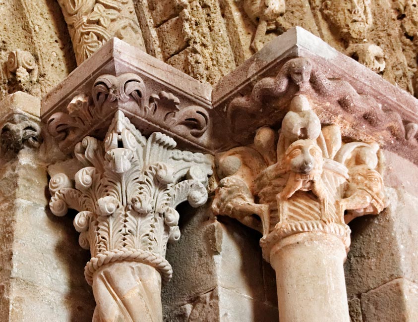 A gauche, ce chapiteau a été restauré récemment. A droite, ce chapiteau montre un décor très souvent employé : des monstres aux angles avalent un animal dont seules les pattes subsistent. Des stries placées en diagonale couvrent le fond de la corbeille, suivant un procédé apparu vers le milieu du XIIème siécle ( cf. Saint-Michel-de-Cuxa). |