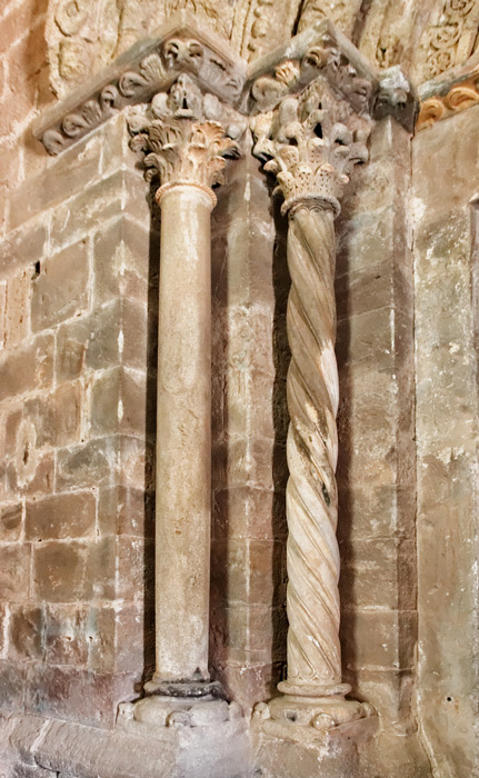 Les deux chapiteaux reprennent le schéma corinthien de plusieurs registres de feuilles d'acanthe. Les pieds présentent, comme souvent, de petites sculptures.