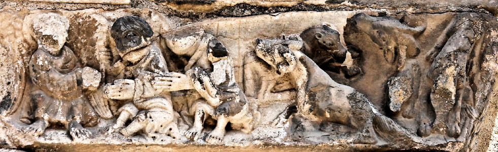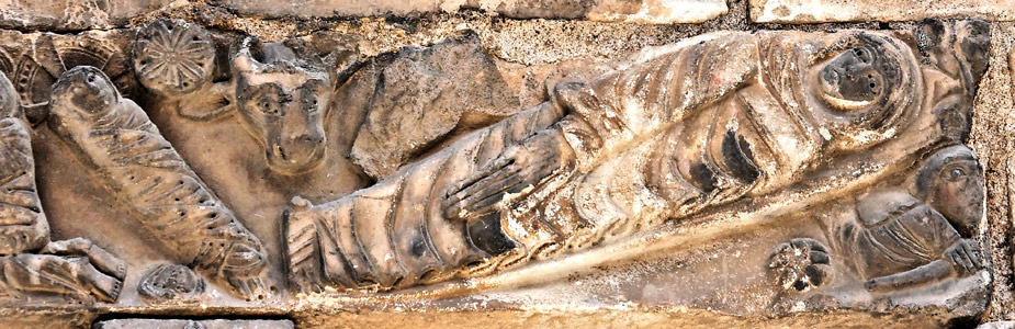 Les scènes de la frise se déroulent de la droite vers la gauche . Ici à gauche un ange aux ailes traitées en écailles s'approche de deux bergers qui tendent leurs mains.. A droite, le troupeau est représenté par un chien et des quadrupèdes. Les animaux de droite sont vus de dessus.