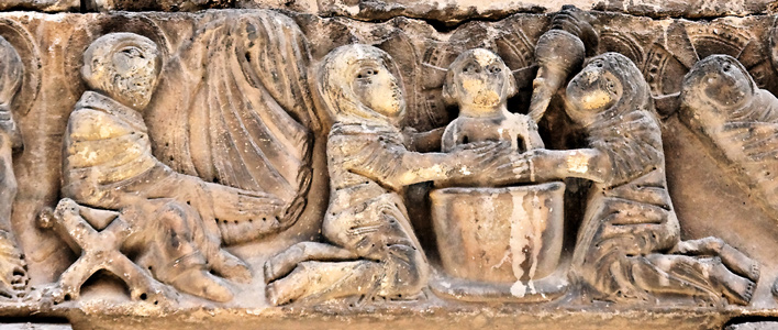 Joseph, assis sur un trône, assiste au bain de Jésus lavé par deux servantes.