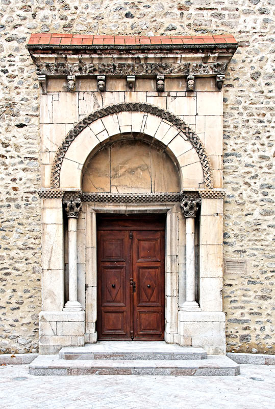 L'église Sainte-Marie a été profondément remaniée depuis sa construction. De l'époque romane,pratiquement seul le portail occidental a été conservé. Taillée dans le marbre blanc de Céret, ce portail est en saillie. Les chapiteaux des colonnes s'apparentent au style de la galerie sud du cloître d'Elne. Une large corniche prend appui sur 7 modillons. Elle est sculptée de 7 scènes de la vie du Christ, qui se lisent de droite à gauche et que vous pouvez voir en gros plan avec la barre de navigation. Elle a été attribuée au Maître de Cabestany et daterait de la seconde moitié du XIIème siècle (G. Mallet,2003)..