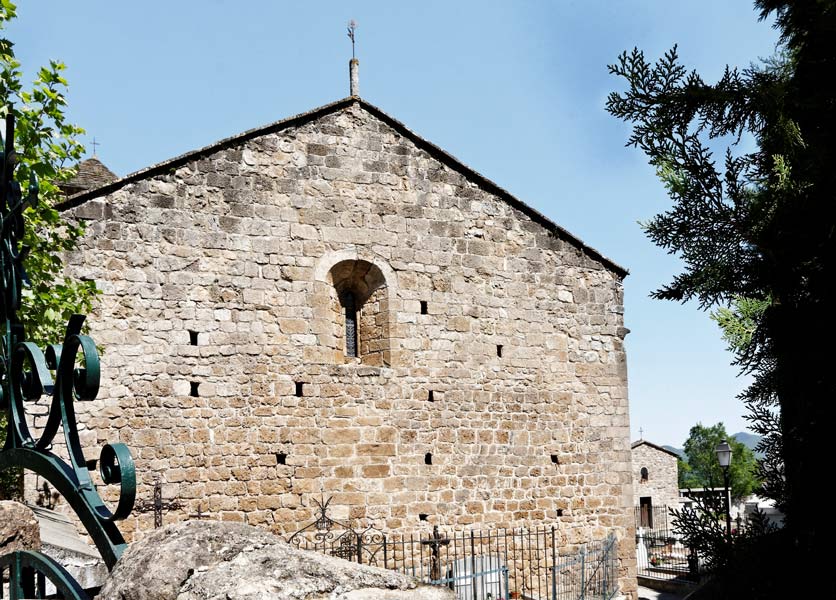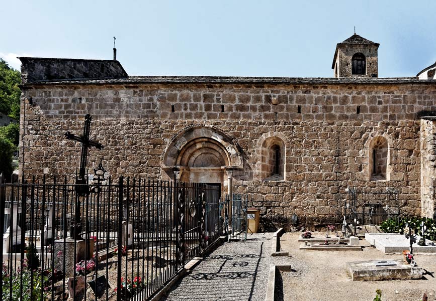 La façade est dépourvue d'entrée, celle-ci se faisant par le côté sud de l'église. Dans la partie droite de la photo, on peut voir dans le cimetière une petite église romane dédiée à Saint Jean-Baptiste, puis à Saint Luc.