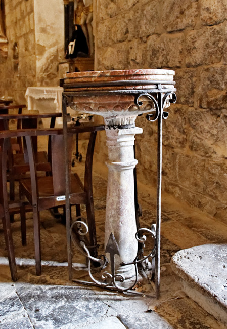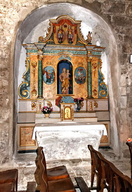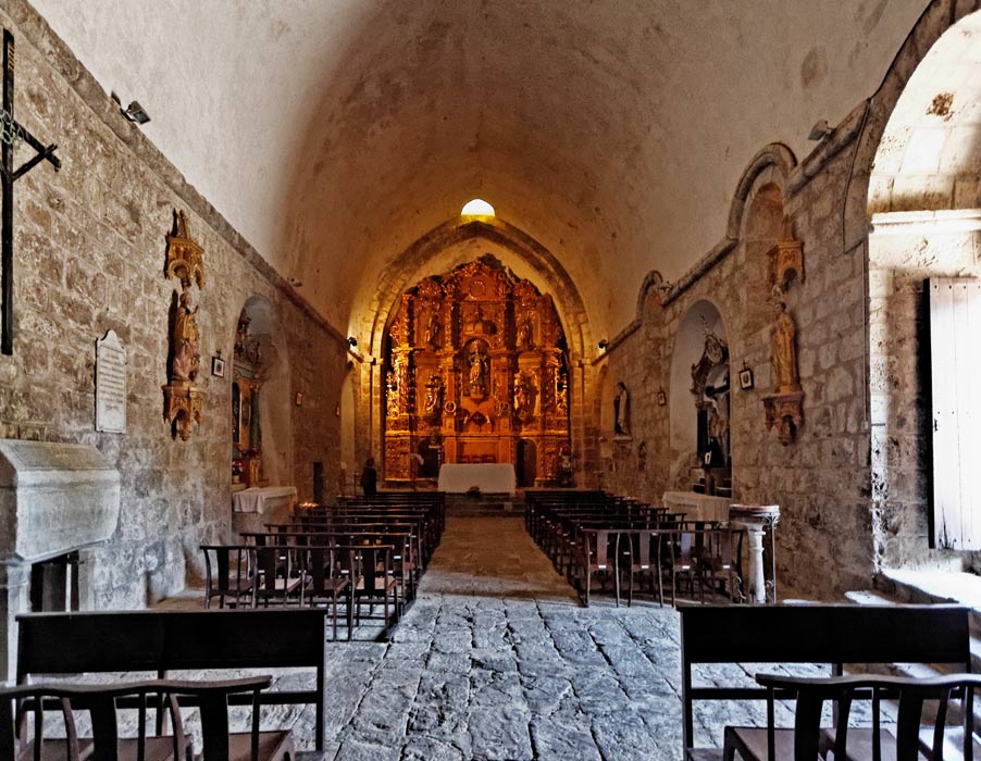 L'église Sainte-Marie de Montferrer est mentionnée dès 939. Sa longue nef est unique. Elle mesure 22,6 mètres de long sur 6 mètres de large. Elle est séparée de l'abside par un faux transept constitué de 2 des 6 chapelles creusées dans l'épaisseur des murs goutteraux (2,2 mètres environ). Le profil des voûtes est brisé. Une corniche sépare les voûtes et les côtés : elle suit le contour des petites fenêtres. A gauche de la vue, un sarcophage réemployé.