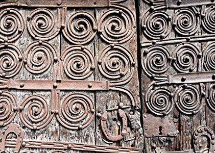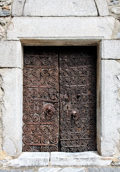 Les deux montants en granit supportent un linteau monolithique, avec au-dessus un arc de décharge et un tympan lisse. Remarquez les belles ferrures romanes qui couvrent la porte en bois.