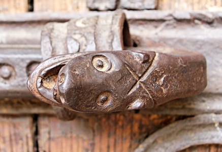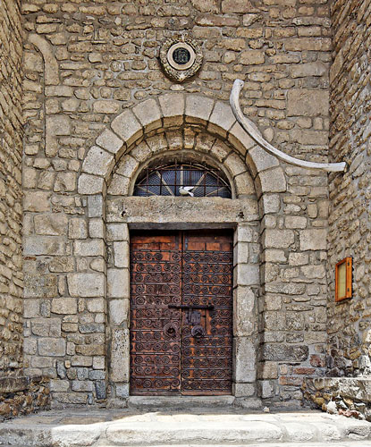 La porte comporte un curieux ex-voto en os de baleine; Elle a conservé ses belles ferrures romanes. Ci-dessus, un gros plan de la tête du verrou. |