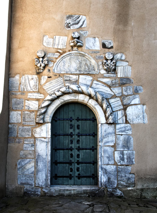 Les éléments ont été placés dans une configuration assez baroque. La voussure est bien au dessus de la porte. Par contre, le tympan est placé au dessus de la voussure et est entouré par des restes de chapiteaux.