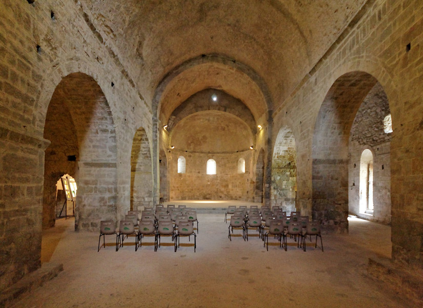 C'est une construction à 3 vaisseaux séparés par des piliers carrés. La nef principale a une largeur de 6,6 mètres, et les nefs latérales 2,30 mètres. L'abside centrale, précédée d'une travée droite est plus large et plus profonde que les absidioles de côté. L'abside méridionale est pourvue d'une fresque décrite par ailleurs. Les parements intérieurs des murs latéraux présentent un frut très prononcé : autrement dit, ils s'écartent en montant de l'axe de la nef. C'est un principe de construction de la période romane, qui permet d'éviter l'écrasement des assises inférieures. Le bas côté septentrional a été transformé en une série de chapelles :l'absidiole nord a été ainsi supprimée lors de ces transformations.