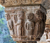 Avec l'abandon du monastère, à la fin du XVIIIème siècle, les pièces taillées et sculptées furent pillées pour orner maisons et jardins des alentours. En 1924, les 13 chapiteaux qui purent être récupérées ont été placées non pas à leur emplacement d'origine, dans un cloître supérieur, mais au niveau du cloître inférieur, dans une colonnade qui fait penser à la galerie de Serrabona. Les chapiteaux les plus anciens (autour de 1170 ) sont en marbre blanc. Les autres, en marbre rose, datent du XIIIème siècle. .