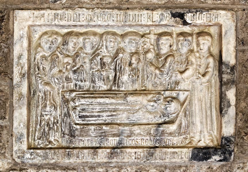 Trois plaques tumulaires en marbre blanc ont été récupérées et placées sur la paroi intérieure du cloître. Celle-ci représente les obsèques de Pierre de Sahora en 1287. Les compositions sont identiques : au premier plan le corps du défunt abbé tenant la crosse abbatiale. Derrière, la communauté des moines, certains portant des outils liturgiques: encensoir, goupillon, croix ou cierge. |