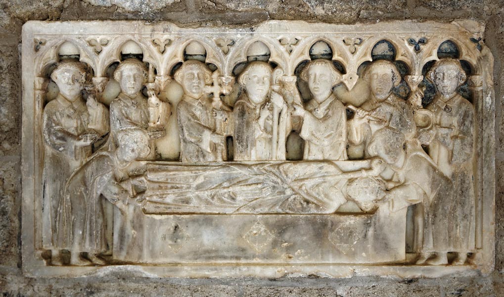 Cette pierre tombale représente les obsèques de Guillaume de Cervoles en 1303. |