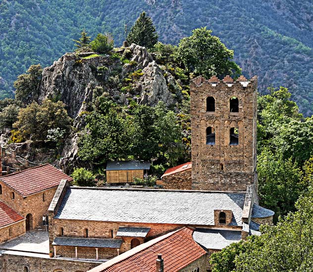 L'église haute et le clocher sont ici photographiés depuis le belvédère. Les ouvertures du 2ème étage sont surmontées d'arcatures dites lombardes, arcs de pierre séparés par des pilastres. |