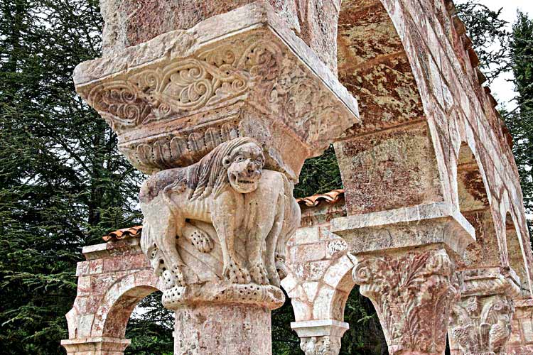 Bien que la scène représentée ressemble à d'autres scènes du reste du cloître, la facture est ici bien meilleure. Le tailloir est magnifiquement sculpté et les crinières des lions sont ciselées avec de nombreux détails ( comme on peut le voir ici avec cette vue en gros plan) |
