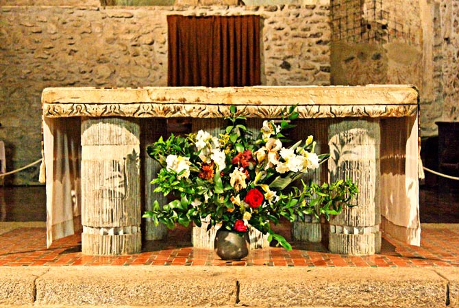 Cette table d'autel est un magnifique bloc de marbre, provenant probablement d'un édifice romain. C'est la table qui a été consacrée mille ans plus tot, retrouvée sur une maison de Vinça où elle servait de balcon. Elle est décorée de feuilles d'acanthe sur la tranche. |