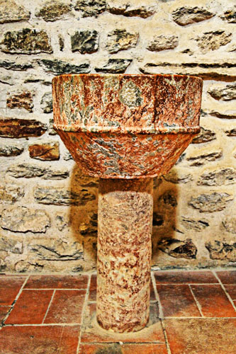 Ce groupe en bois représente l'Agonie de Jésus au Mont des Oliviers. Le Christ est en prière, un ange lui présente un calice pour le réconforter. Pierre, Jacques et Jean sont endormis. Ce thème est assez rare dans la région. Le caractère baroque de l'ange conduit à le dater du XVIIème siècle. |