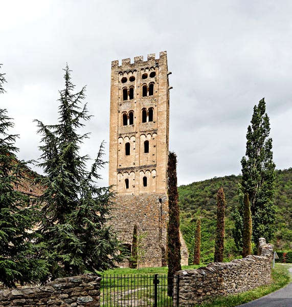 Ce clocher-tour de 38 m de haut est le seul qui reste des deux tours construites aux deux bouts du transept, très probablement sous l'abbatiat d'Oliba. La bande verticale qui court depuis le sommet souligne la verticalité. Les deux étages du haut comportent des fenêtres géminées. L'ensemble est terminé par une série d'oculi et des festons qui se découpent sur le ciel. La deuxième tour s'est effondrée pendant l'hiver 1839, détruisant une partie du transept.. |