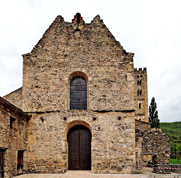 La façade est ici vue depuis l'atrium qui a été construit sous l'abbatiat d' Oliba. L'arc outrepassé de l'entrée a été raboté. La façade est construite en blocs irréguliers. Côté nord, les bâtiments datent du XVIIème siècle. Côté sud, on aperçoit les vestiges de la galerie qui conduisait de l'église à la chapelle de la Trinité qui se trouve derrière soi lorsqu'on regarde la façade. |